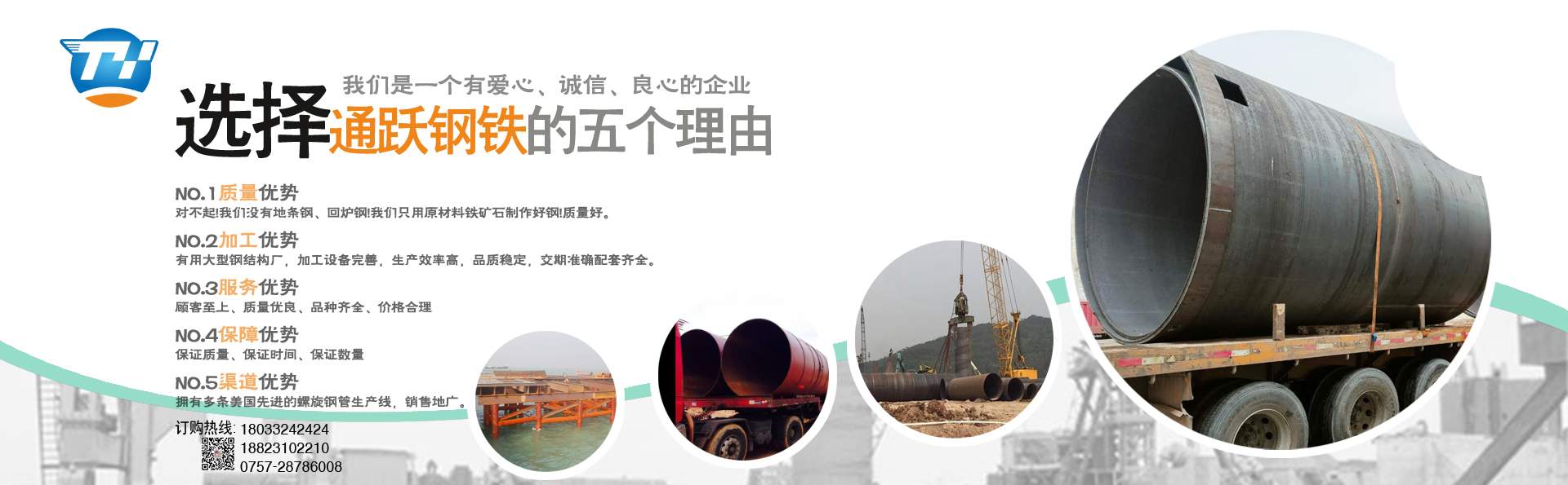 佛山市通躍鋼鐵有限公司 電話180-2228-4448 0757-28786008 擁有多條美國先進的螺旋鋼管生產(chǎn)線,生產(chǎn)直徑φ159-φ3620mm(壁厚6mm-20mm)的雙面埋弧螺旋焊鋼管,年生產(chǎn)能力15萬噸。 生產(chǎn)螺旋管 螺旋鋼管 螺旋焊管 規(guī)格厚度6mm-20mm 直徑159mm-3620mm 有多條鋼板卷管機生產(chǎn)規(guī)格厚度6mm-70mm 直徑400mm-5020mm 螺旋管 螺旋鋼管 鋼護筒 焊接鋼護筒 鋼板卷管 丁字焊管 加工格構(gòu)柱 鋼管樁 材質(zhì)Q235B Q345B Q235A 45# 20# Q420D Q390D 錳板 歡迎來電報價,公司配有大型型材 鋼板倉庫,大量各種規(guī)格現(xiàn)貨H型鋼 槽鋼 角鋼 工字鋼 鋼板,鍍鋅方管 鍍鋅產(chǎn)品 產(chǎn)品可以定尺定長,提供打砂,除銹,上油漆,公司配有防腐加工廠,專業(yè)對鋼管進行內(nèi)外壁防腐加工,鋼管外壁主要有三油兩布,五油三布,環(huán)氧煤瀝青及環(huán)氧樹脂漆,各種高分子涂料。鋼管主要有飲用水涂料IPN8710-2B,水泥砂漿及各種環(huán)氧涂料,IPN8710飲用水防 ……了解更多